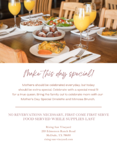 Our Mother’s Day Special: a wonderful made-to-order omelet bar, mimosas, stone baked pizzas, and music by Hannah Acoustic. Let us spoil you this year!