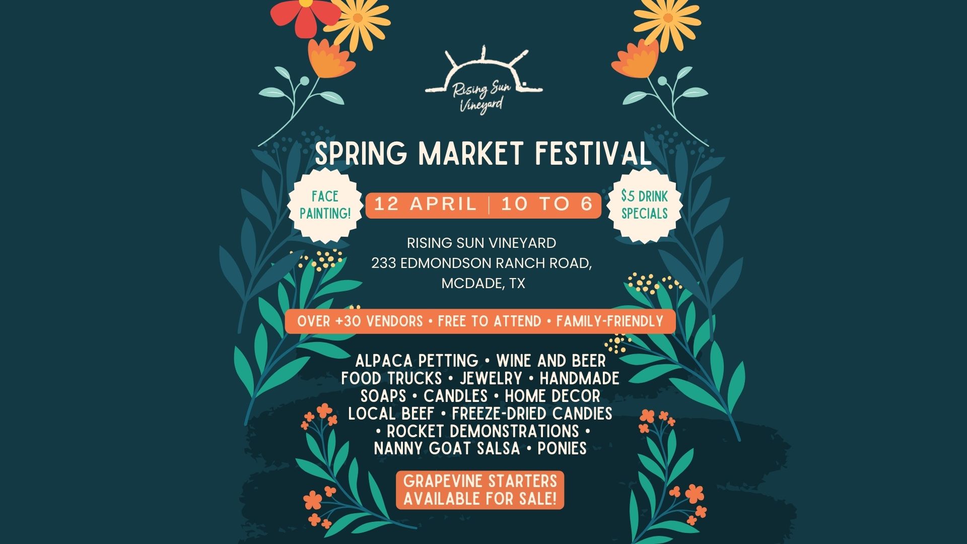 Join us for Rising Sun Vineyard’s 5th Annual Spring Market Festival in Mcdade, Texas– your one-stop destination for spring fun and local shopping!