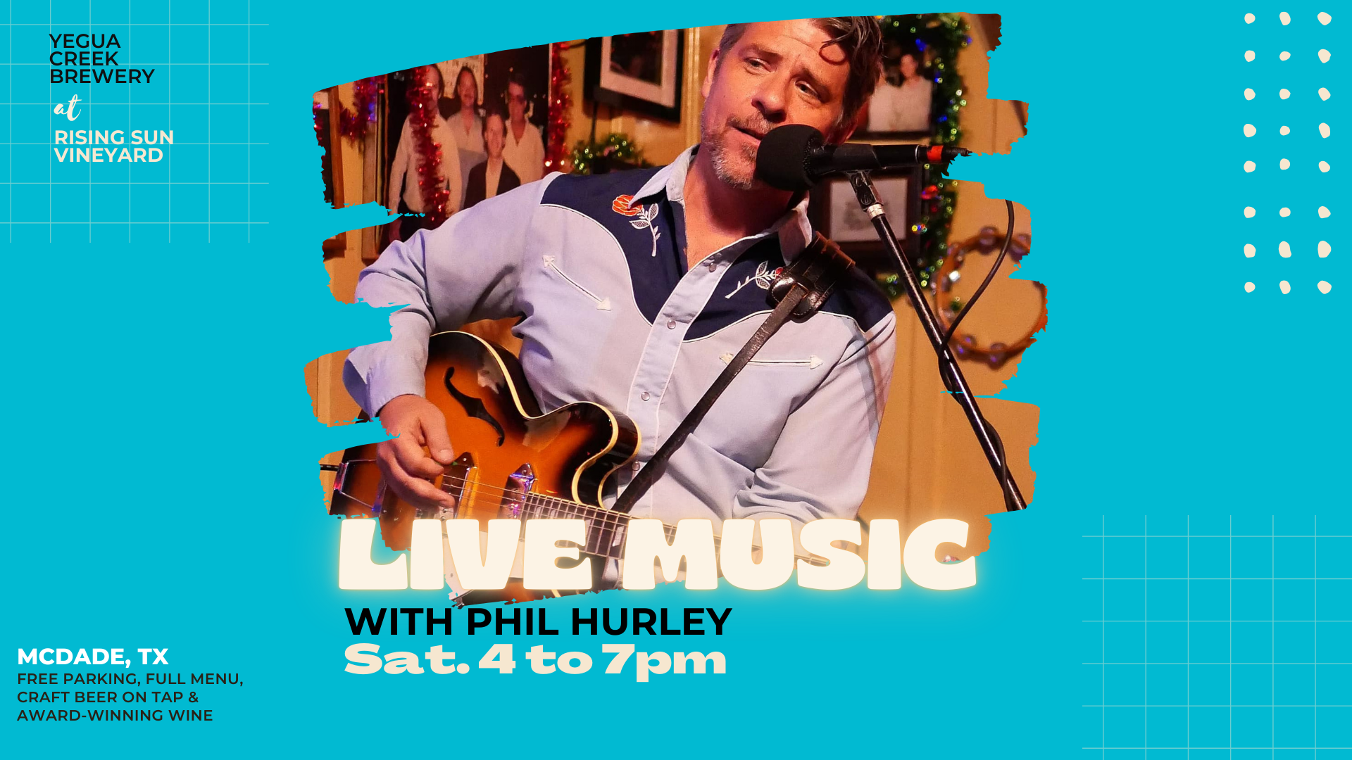 Come listen to live music by this amazing musician at Rising Sun Vineyard from 2-5pm! Phil Hurley is a great Americana artist and a joy to listen to. Join us if you’re in the Bastrop or McDade area for a beautiful countryside view while listening to this dynamic performance.
